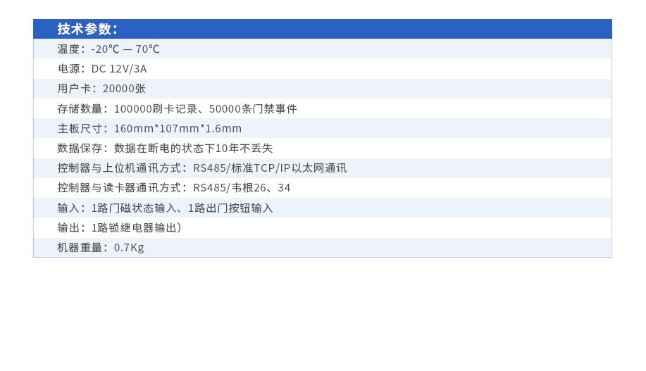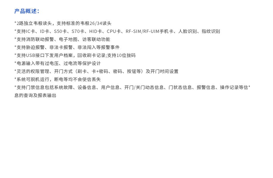 2路獨立韋根讀頭,支持標(biāo)準(zhǔn)的韋根26/34讀頭 支持IC卡、ID卡、S50卡、S70卡、HID卡、CPU卡、RF-SIM/RF-UIM手機卡、人臉識別、指紋識別 支持消防聯(lián)動報警、電子地圖、訪客聯(lián)動功能 支持脅迫報警、非法卡報警、非法闖入等報警事件 支持USB接口下發(fā)用戶檔案,回收刷卡記錄;支持10位拔碼 電源輸入帶有過電壓、過電流等保護設(shè)計 靈活的權(quán)限管理、開門方式(刷卡、卡+密碼、密碼、按鈕等)及開門時間設(shè)置 系