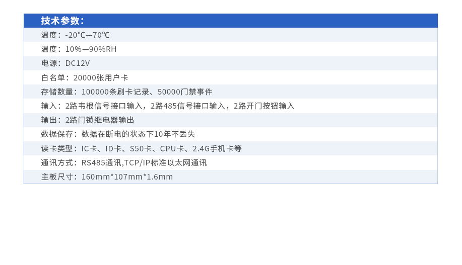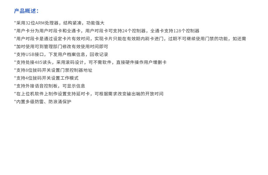 采用32位ARM處理器,結(jié)構(gòu)緊湊,功能強大 用戶卡分為用戶時段卡和全通卡,用戶時段卡可支持24個控制器,全通卡支持128個控制器 用戶時段卡是通過設(shè)定卡片有效時間,實現(xiàn)卡片只能在有效期內(nèi)刷卡進門,過期不可繼續(xù)使用門禁的功能,如還需加時使用可到管理部門修改有效使用時間即可 支持USB接口,下發(fā)用戶檔案信息,回收記錄 支持處接485讀頭,采用滾碼設(shè)計,可不需軟件,直接硬件操作用戶增刪卡 支持8位拔碼開關(guān)設(shè)置門禁控制器地址 支持4位拔碼開關(guān)