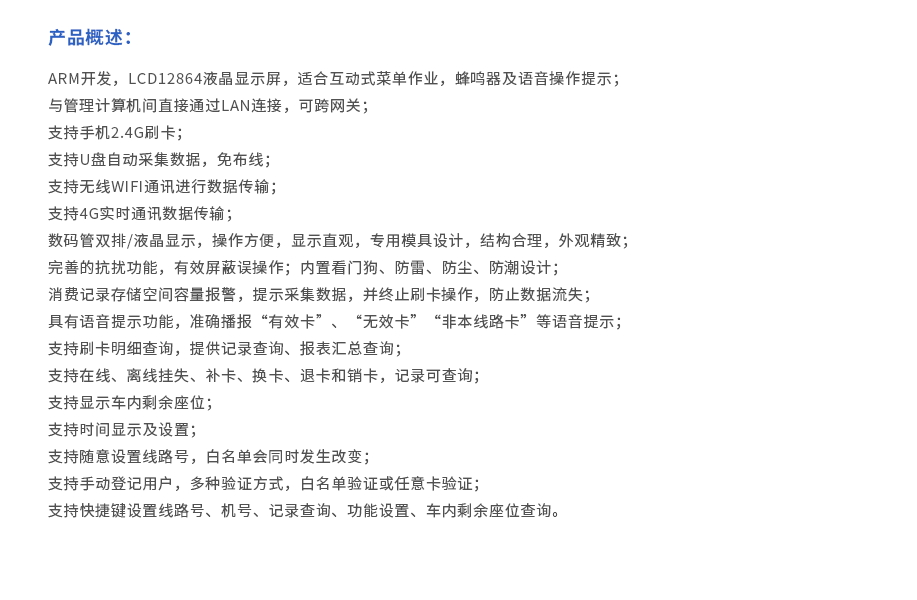 32位ARM內核處理器,數碼管雙排/液晶顯示 有聯網和脫機兩種工作模式 有計算器、份飯、菜號等多種消費模式,方便消費操作,且可自由切換 自動對所有消費記錄進行統(tǒng)計處理。生成各種明細表、匯總表,如:按餐、按日、按月、按年、按個人、按個人、按部門、按食堂、按終端、按售飯窗口等多種報表 蜂鳴器及語音操作提示 與管理計算機間直接通過LAN連接,可跨網關 單網段最大聯網255臺;多網段對聯網數量無限制 支持在售飯機上直接查詢該餐或該天累計