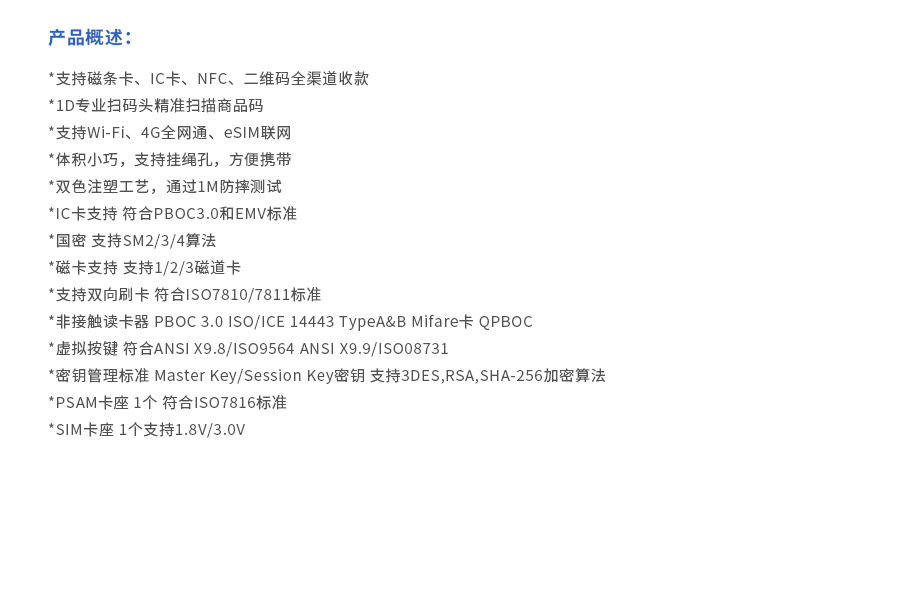 ●支持磁條卡、IC卡、NFC、二維碼全渠道收款 ●1D專業(yè)掃碼頭精準(zhǔn)掃描商品碼 ●支持Wi-Fi、4G全網(wǎng)通、eSIM聯(lián)網(wǎng) ●體積小巧,支持掛繩孔,方便攜帶 ●雙色注塑工藝,通過1M防摔測(cè)試 ●IC卡支持 符合PBOC3.0和EMV標(biāo)準(zhǔn) ●國密 支持SM2/3/4算法 ●磁卡支持 支持1/2/3磁道卡 ●支持雙向刷卡 符合ISO7810/7811標(biāo)準(zhǔn) ●非接觸讀卡器 PBOC 3.0 ISO/ICE 14443 Type