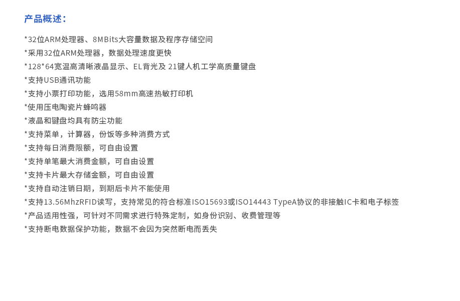 ●32位ARM處理器、8MBits大容量數(shù)據(jù)及程序存儲(chǔ)空間 ●采用32位ARM處理器,數(shù)據(jù)處理速度更快 ●128*64寬溫高清晰液晶顯示、EL背光及 21鍵人機(jī)工學(xué)高質(zhì)量鍵盤 ●支持USB通訊功能 ●支持小票打印功能,選用58mm高速熱敏打印機(jī) ●使用壓電陶瓷片蜂鳴器 ●液晶和鍵盤均具有防塵功能 ●支持菜單,計(jì)算器,份飯等多種消費(fèi)方式 ●支持每日消費(fèi)限額,可自由設(shè)置 ●支持單筆最大消費(fèi)金額,可自由設(shè)置 ●支持卡