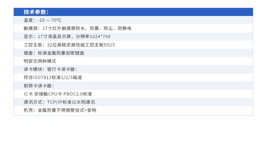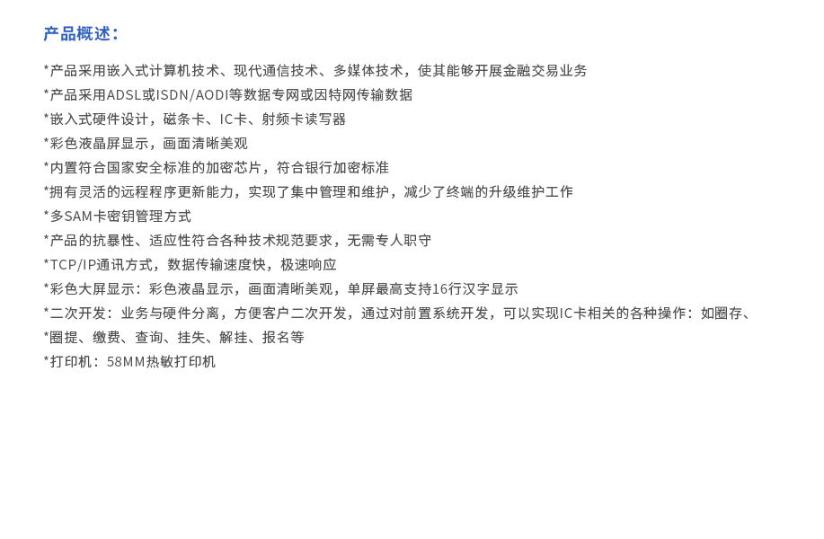 ●產品采用嵌入式計算機技術、現(xiàn)代通信技術、多媒體技術,使其能夠開展金融交易業(yè)務 ●產品采用ADSL或ISDN/AODI等數(shù)據(jù)專網(wǎng)或因特網(wǎng)傳輸數(shù)據(jù) ●嵌入式硬件設計,磁條卡、IC卡、射頻卡讀寫器 ●彩色液晶屏顯示,畫面清晰美觀 ●內置符合國家安全標準的加密芯片,符合銀行加密標準 ●擁有靈活的遠程程序更新能力,實現(xiàn)了集中管理和維護,減少了終端的升級維護工作 ●多SAM卡密鑰管理方式 ●產品的抗暴性、適應性符合各種技術規(guī)范要求,無需專人