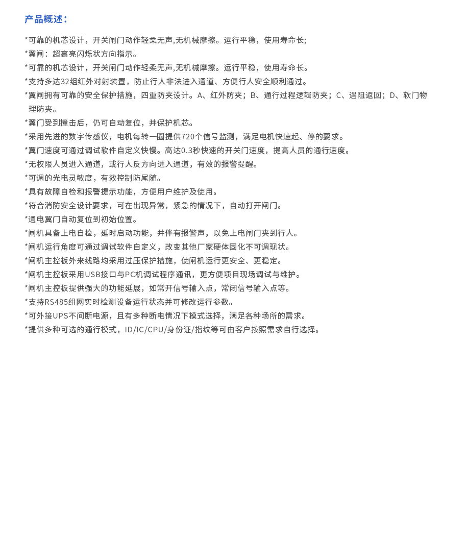 翼閘擁有可靠的安全保護(hù)措施,四重防夾設(shè)計。A、紅外防夾;B、通行過程邏輯防夾;C、遇阻返回;D、軟門物理防夾。